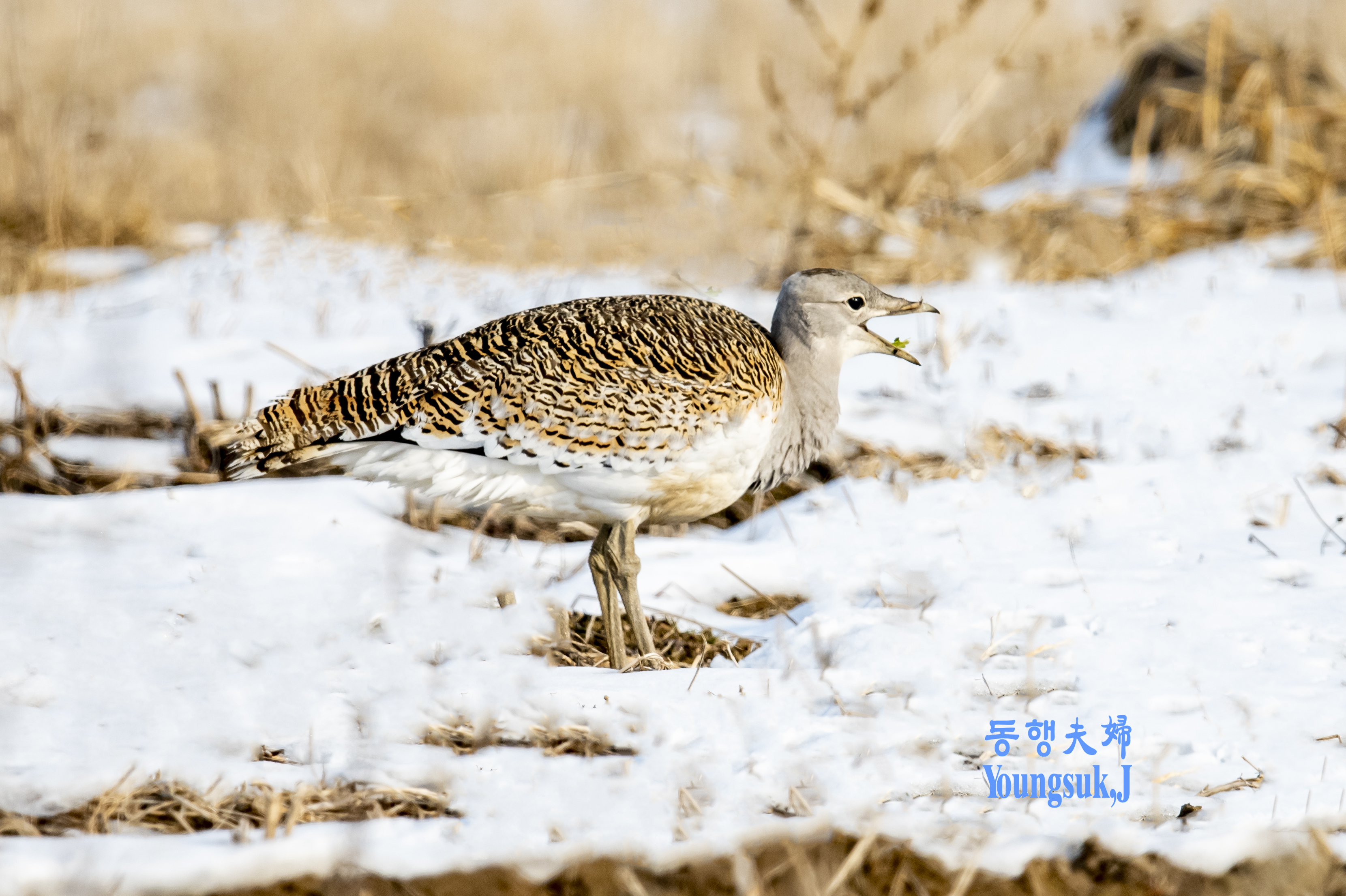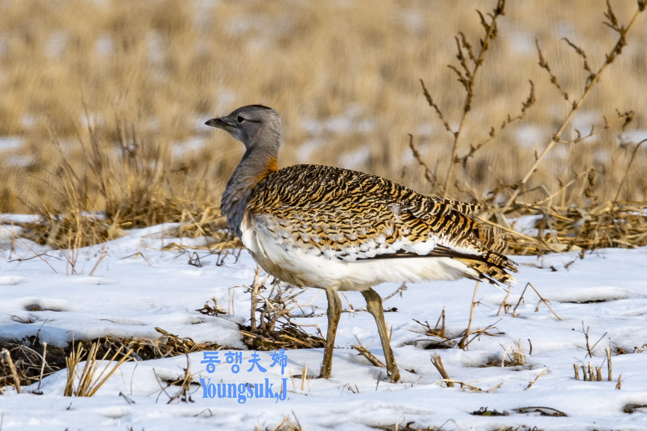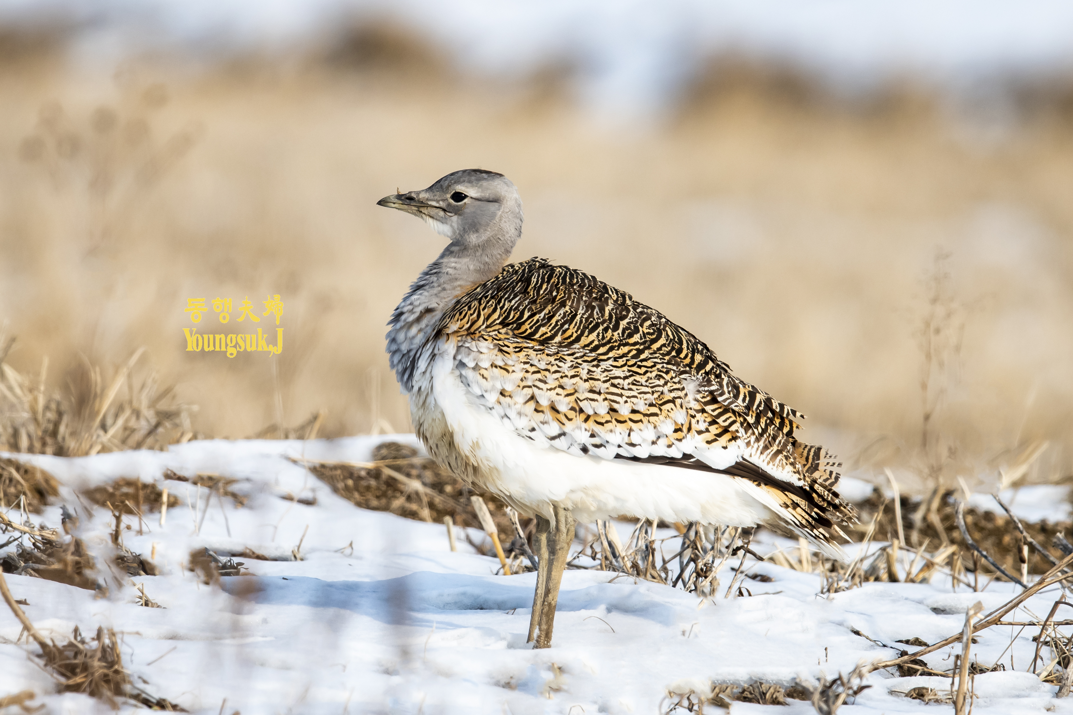 몸길이는 수컷이 102cm, 암컷이 76cm로 수컷이 훨씬 큽니다. 수컷은 목에서 가슴까지 짙은 갈색이고 암컷은 회색입니다. 남자의 가슴에는 갈색 띠가 있지만 여자는 없다. 부리는 황갈색이고 꼬리는 흑갈색으로 엷은 검은색 가로무늬가 있으며 배는 흰색이다. 주로 넓은 평야, 경작지, 잡초가 적은 곳에 둥지를 틀고 2~3개의 알을 낳는다. 당신의 성격은 경계선이 강합니다. 한국전쟁 이전에는 우리나라에서 흔히 볼 수 있는 겨울새였지만 지금은 희귀한 새가 되었습니다.