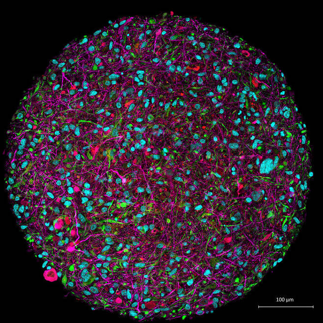 위의 그림을 보세요. 그건 인간이야 신경 세포, 즉 뉴런실험실에서 성장한 “뇌 오가노이드”입니다.