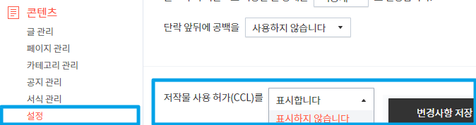 CCL 표시를 설정하려면 관리 > 기본 정보 > 콘텐츠 공유 설정 > CCL 설정으로 이동합니다. 작성자 지침은 필수입니다. 기본적으로 설정되어 있습니다. 저작물을 상업적인 목적으로 사용할 수 있는지, 저작물을 수정 또는 2차 제작할 수 있는지 여부를 결정하고 확인하십시오.마지막 단계, CCL 로고를 신청해야 합니다.